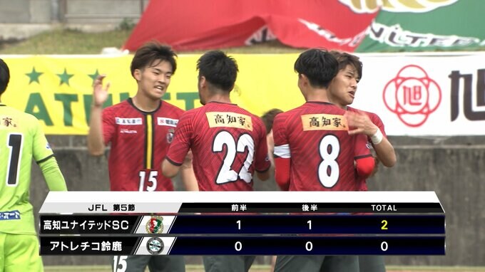 4連勝と勢いに乗る高知。5戦目の相手は2連敗中のアトレチコ鈴鹿です。高知は前半17分、10番佐々木(ささき)からの右サイドからのクロスを15番宇田(うだ)が押し込み、幸先よく先制します。