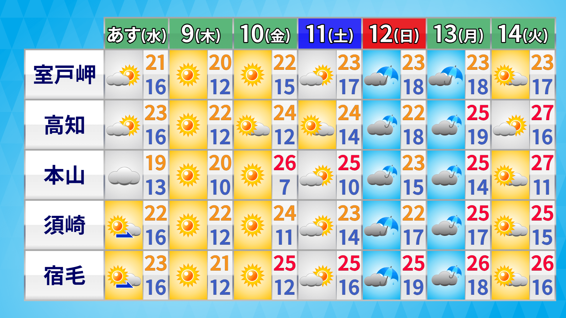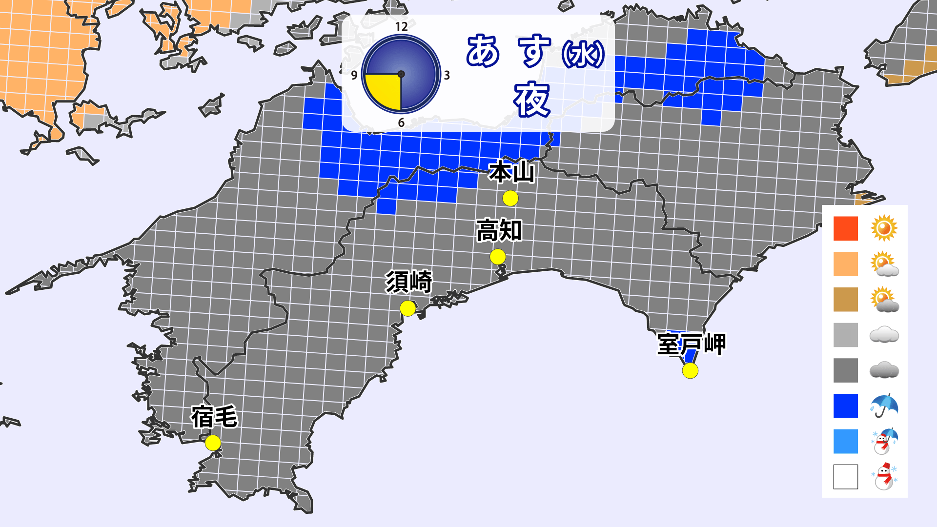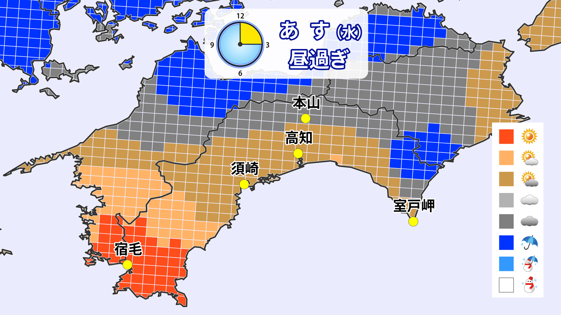 天気を時間ごとに見ると午前中は晴れ間がありそうです。午後になると雲が広がり、急な雨となる所もありそうです。青色だけでなく、グレーや茶色の地域でも天気の急変に注意してください。