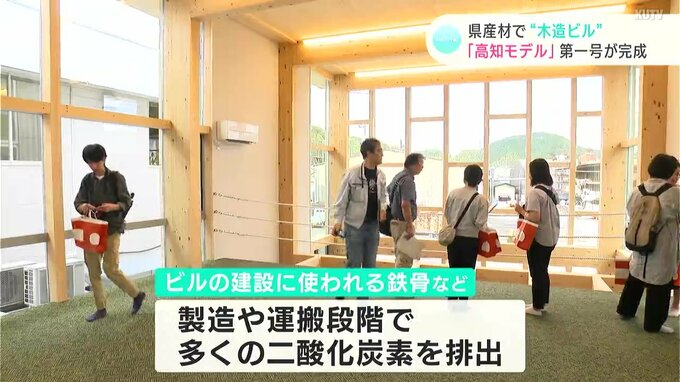 6日に行われた完成見学会には、県内外から建築関係者およそ90人が参加しました。通常、ビルの建設に使われる鉄骨などは、製造や運搬段階でも多くの二酸化炭素を排出しています。県産の木材を使用することで、運搬時間が短縮され、二酸化炭素の排出量の削減にもつながるということです。