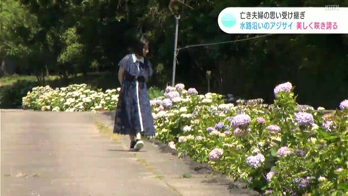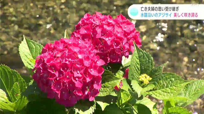 用水路に彩りを添えようと、地域に住む夫婦が20年ほど前から植え始めたというアジサイ。今は亡き2人の思いを受け継ぐ地域の人たちが懸命に手入れを続け、その美しさは守られています。