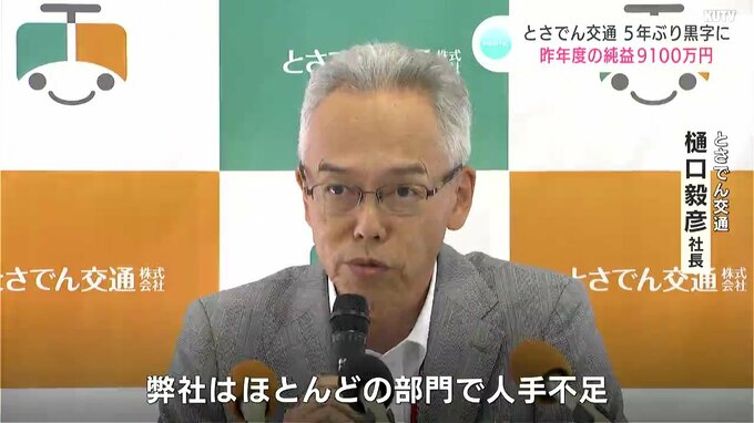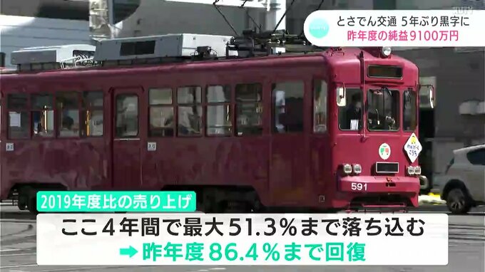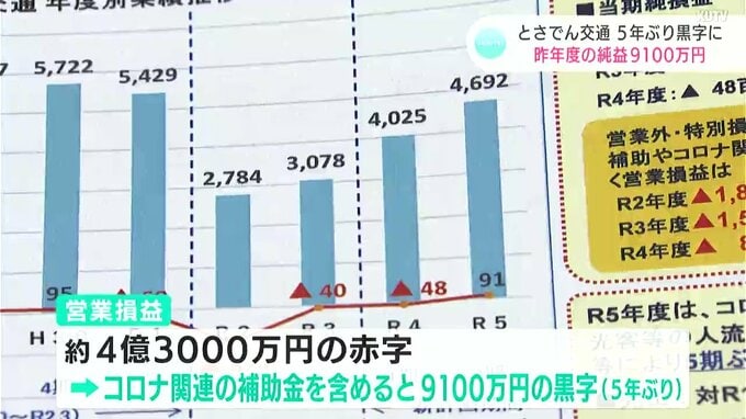 とさでん交通によりますと2023年度の売上はおよそ47億円と前の年度をおよそ7億円上回りました。営業損益は、4億3000万円の赤字でしたが、コロナ関連などの補助金を含めると9100万円の5年ぶりの黒字となりました。