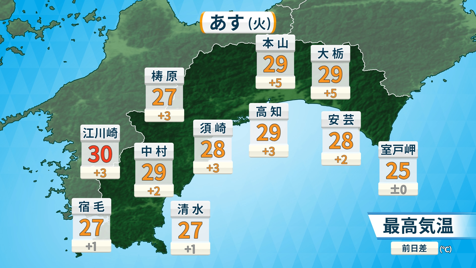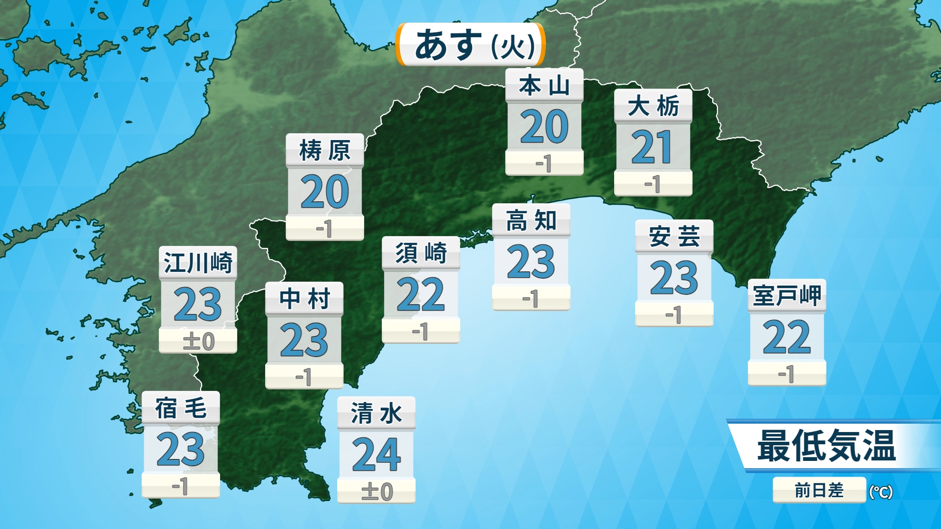 朝の最低気温は24日と同じくらいで、全域で22度前後の予想です。夜は少し寝苦しく感じるような気温となるでしょう。