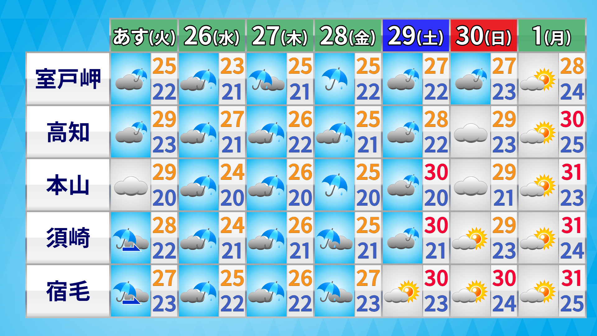 日中の最高気温は30度ほどで、昼間はジメジメと蒸し暑くなりそうです。日差しが少なくても、熱中症に注意してください。