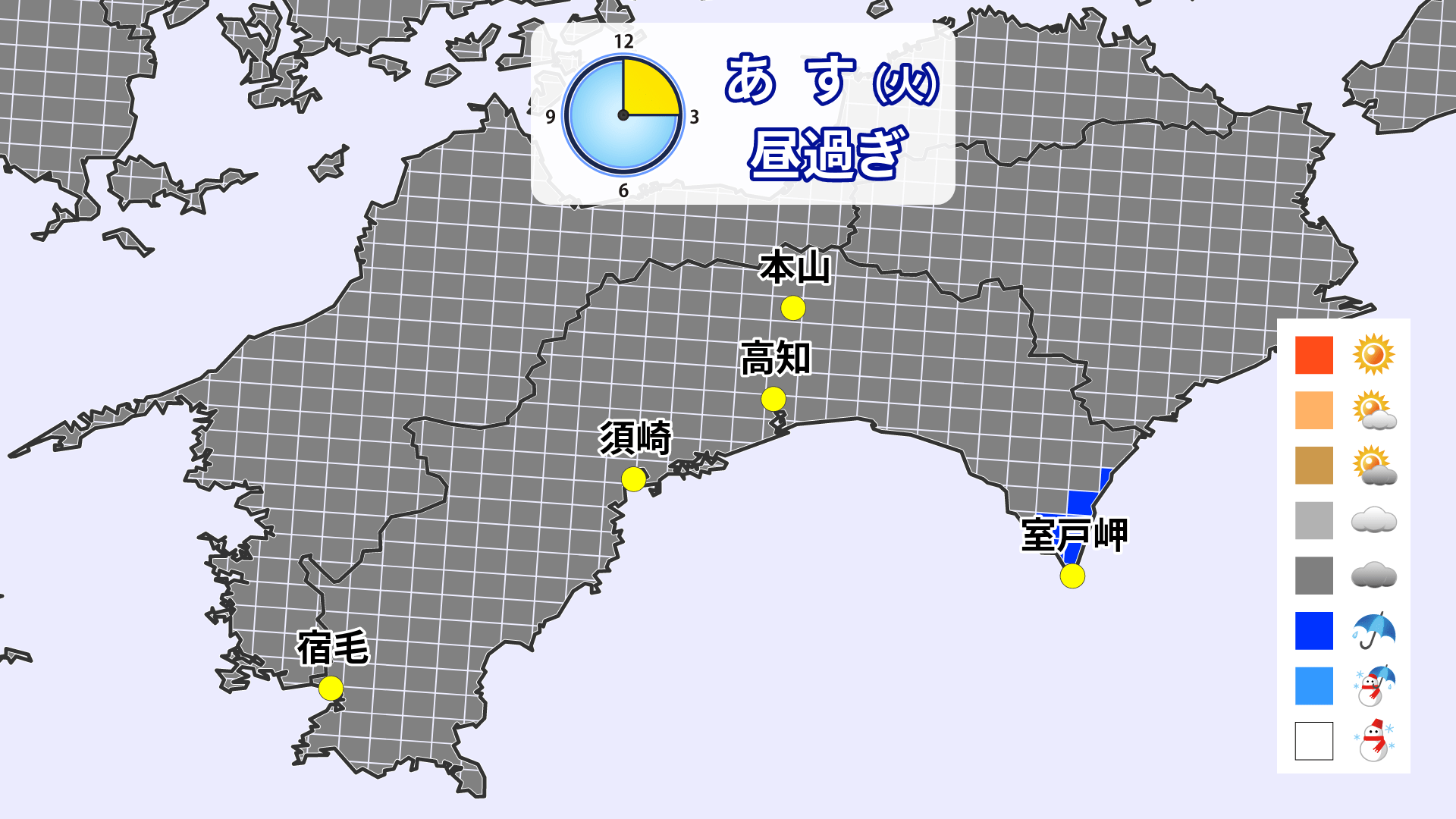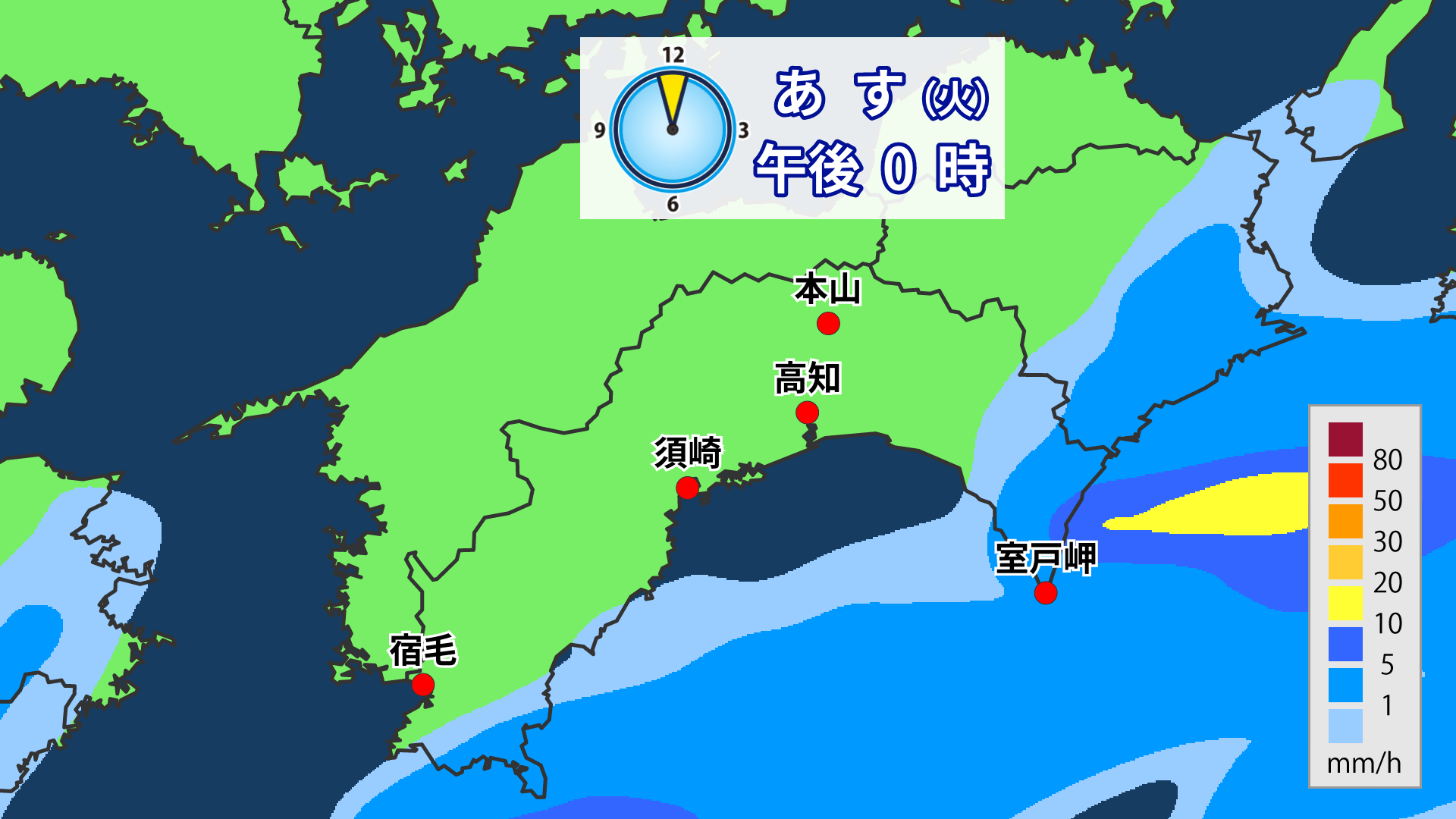 25日の午前中は高知県の広い範囲で雨となるでしょう。午後になると雨雲は離れ、次第に天気は回復に向かう予想です。