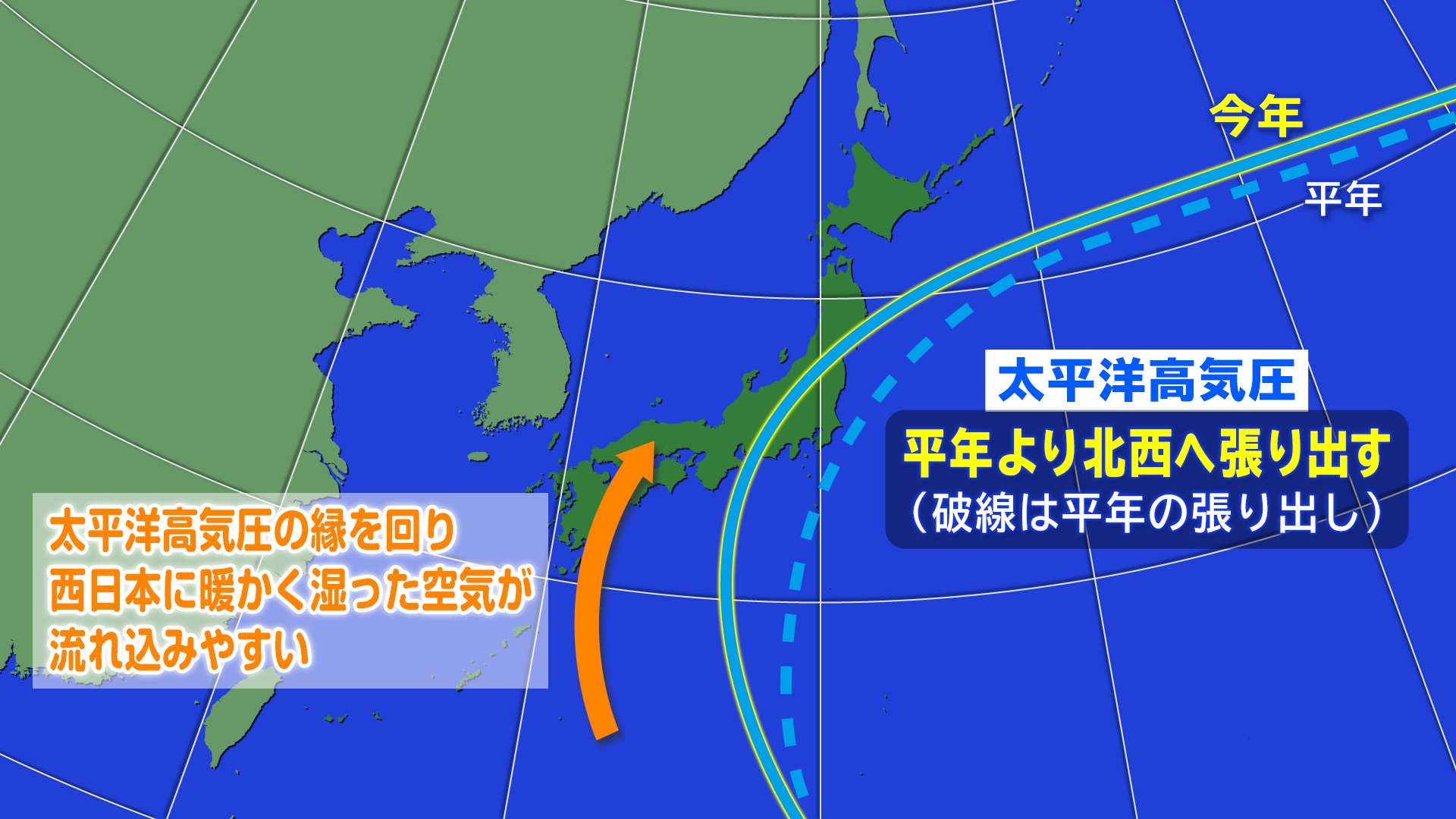 また、高気圧は時計回りの回転を持っているので、高気圧の縁に沿って空気が噴出していますが、今年は太平洋高気圧が北西に張り出すことで、縁を回る暖かく湿った空気が西日本に流れ込みやすくなる見込みです。その結果、湿った空気の影響を受ける西日本で降水量が多く、高気圧が張り出して覆われる関東甲信や北陸・東海地方では晴れて降水量が少なくなります。