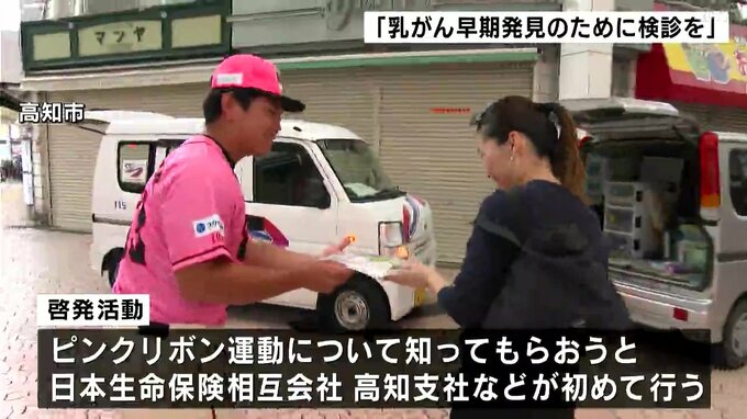 この活動は乳がんの早期発見やがん検診の大切さを伝えるピンクリボン運動について知ってもらおうと、日本生命保険相互会社高知支社などが、初めて行いました。
