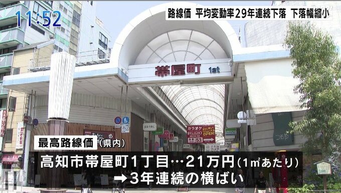 最高路線価は高知市の帯屋町1丁目で(帯屋町商店街)1平方メートルあたり21万円と3年連続の横ばいとなっています。