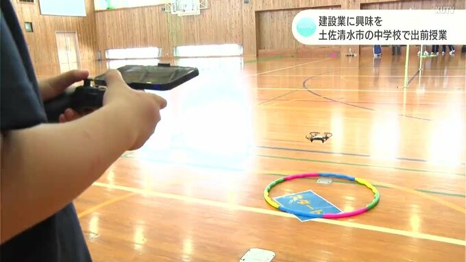 清水中学校で行われた出前授業は県などが推進する建設業の担い手を確保するための取り組みの一環で、2年生59人が参加しました。中学生に建設業を身近に感じてもらい、将来、職業の選択肢の一つとして考えてもらおうというのが狙いです。出前授業では幡多土木事務所の職員が土木事業の役割について説明を行ったほか、体験学習も行われました。建設現場では測量や空撮などに活用するドローン。県建設業協会土佐清水支部の協力を得て3機の小型ドローンを体育館で飛ばします。