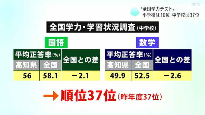 中学生の国語と数学の正答率は共に全国平均を2ポイント程下回りましたが、順位は37位と去年と同じとなりました。