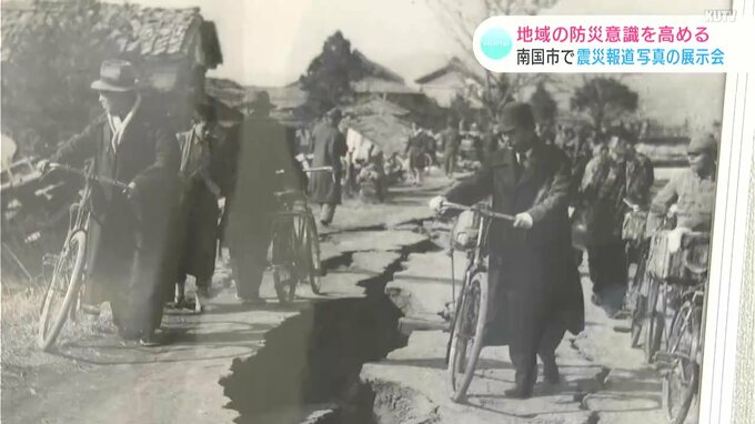 この展示会は南国市植田地区の自治会が地域の防災意識を高めようと初めて開いていて、東日本大震災や熊本地震などの被災地で撮影された100点の写真が展示されています。1946年の昭和南海地震の際に撮影されたものもあり、地面が大きく割れている様子や住宅が崩れている様子などから被害の大きさを知ることができます。