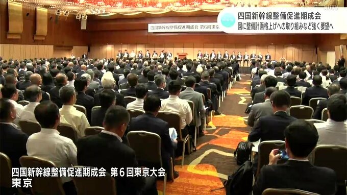 四国新幹線は将来の公共交通の軸として四国4県の知事や地域の経済界の代表者らでつくる「整備促進期成会」が誘致に向け様々な活動を進めています。21日、東京で開かれた決起大会には、過去最多のおよそ600人が出席しました。
