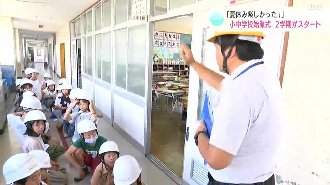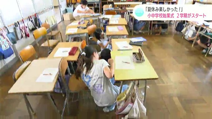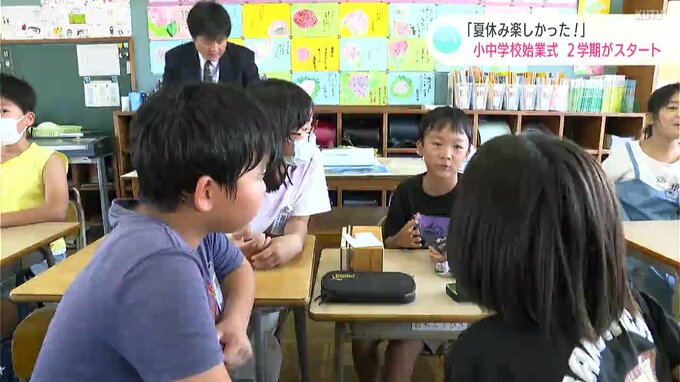 熱中症対策で始業式は校内放送で行われ、岡村君代校長は「自分の思いや考えを伝えること、周りの人を大切にすることを心がける2学期にしましょう」と呼びかけました。久しぶりの再会に盛り上がる子どもたち。みんな、どんな夏休みを過ごしたのかな?