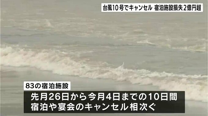 主な原因は台風10号。宿泊のキャンセルは、1万9049人、宴会のキャンセルは、3000人で、合わせておよそ2億934万円分にのぼります。