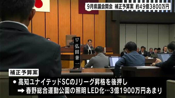高知県議会9月定例会が開会し、南海トラフ地震対策の強化や高知ユナイテッドSCのJリーグ昇格を後押しするための事業費を含む、およそ49億3800万円の補正予算案が提出されました。