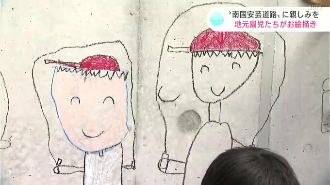 高知県安芸市では高知東部自動車道の南国安芸道路の建設が進められています。この道路に親しみをもらおうと25日、地元の2つの保育所の園児たちが道路をまたぐ生活道の橋に絵を描きました。土佐国道事務所などが企画した取り組みで、園児たちは自分の好きなものや友だちとの思い出などを夢中になって描いていました。