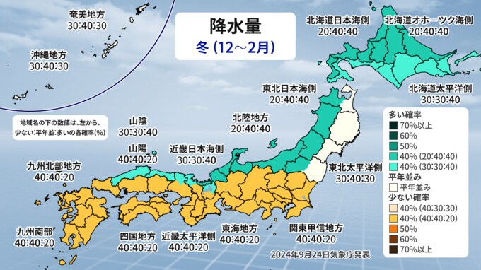 降水量は東日本・西日本の太平洋側で平年より少なく、北海道と東日本・西日本の日本海側で平年よりも多くなる予想です。北日本から西日本の日本海側では雪の量も多くなるでしょう。冬型の気圧配置が強まることが主な要因です。