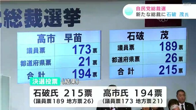 決選投票の結果、議員票と地方票を合わせて石破氏が215票、高市氏が194票となり元幹事長の石破茂氏が自民党の新総裁に選ばれました。