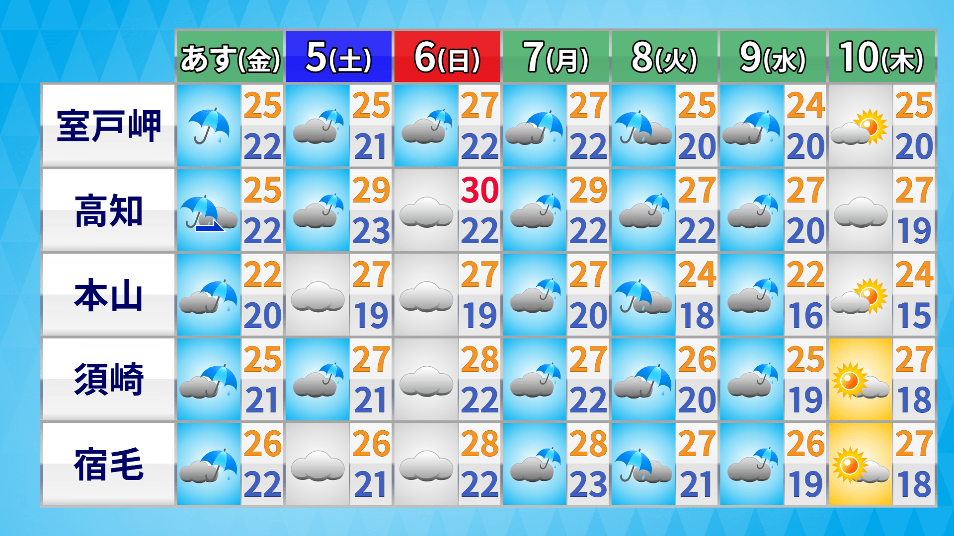 日曜日は高知市で30度と真夏日が予想されています。半袖は、まだしまわないようにしてください。週明けは再び天気がぐずつき、雨となる日が多くあるでしょう。晴れ間が戻るのは来週の半ば頃となりそうです。(気象予報士・東杜和)