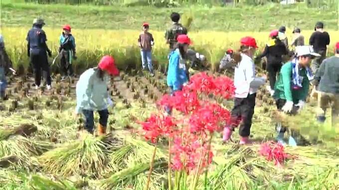 この取り組みに賛同した具同(ぐどう)小学校では、5年生が総合学習の一環として同じ農法での米づくりを体験していて、7日は、児童81人がノコギリガマを使って稲刈りを行ないました。初めての児童も多くいましたが、作業を進めるうちにカマを引くコツを覚えて手ぎわ良く刈り取ります。
