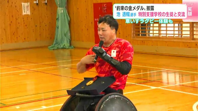 スポーツ 生徒との“約束の金メダル”お披露目!パリパラ“金メダル”車いすラグビー池透暢選手が特別支援学校の生徒と交流 2024年10月16日(水) 19:14 国内 話題・グルメ パリパラリンピックで金メダルを獲得した車いすラグビーの池透暢(いけ・ゆきのぶ)選手が、大会前にエールを貰っていた特別支援学校の生徒たちに“約束の金メダル”をお披露目しました。車いすラグビー体験も行わ…