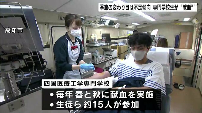 四国医療工学専門学校では、毎年、春と秋に献血を行っていて、30日は生徒らおよそ15人が集まりました。