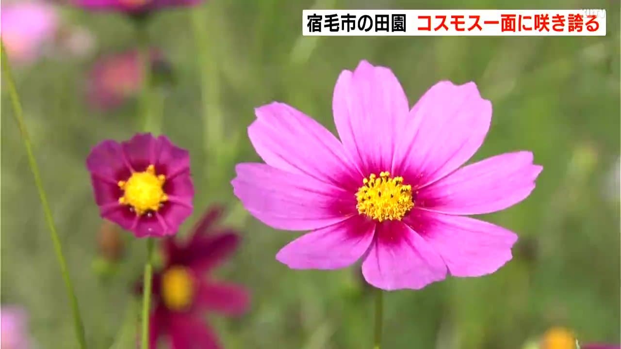 高知県宿毛市の田園ではコスモスの花が咲き誇り、訪れる人達を楽しませています。