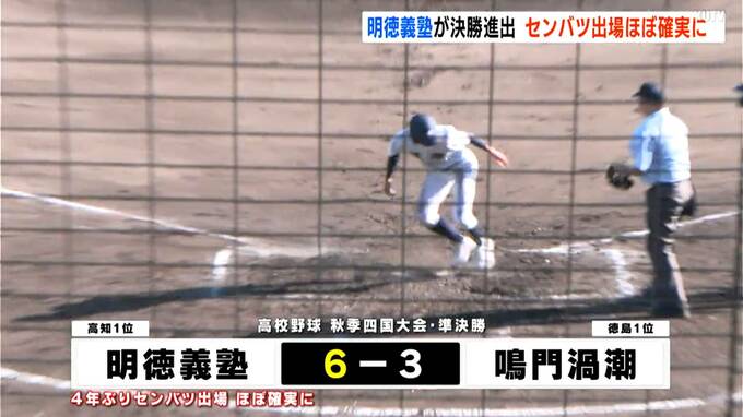 秋の高校野球四国大会の準決勝が、3日、高知県高知市で行われ、高知1位の明徳義塾が、徳島1位の鳴門渦潮に勝利し、来年春のセンバツ出場を"ほぼ確実"としました。