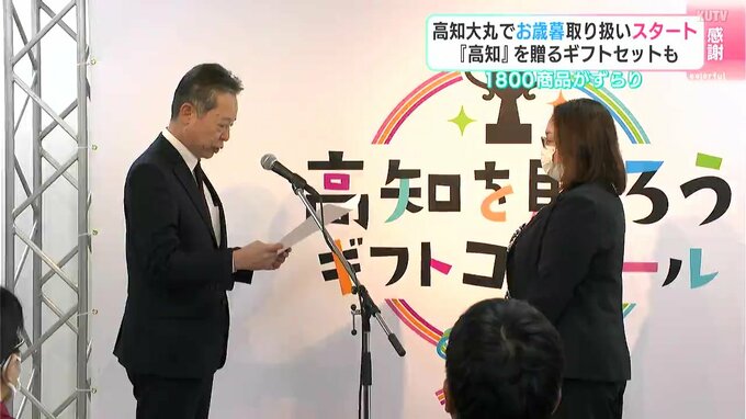 高知大丸で取り扱いが始まった今年のお歳暮は、1800ある商品のうち、およそ150点が高知の商品です。ギフトセンターがある会場には、カツオのタタキや果物、ユズ飲料など、高知を代表する商品の見本が並んでいます。本来「全国の物」を扱う百貨店ですが大丸松阪屋では地方にスポットをあてた取り組みを進めていて、高知大丸も地産外商に力を入れています。