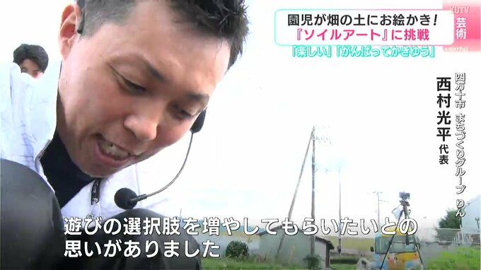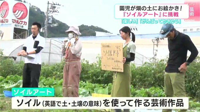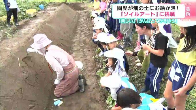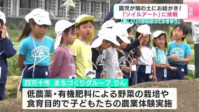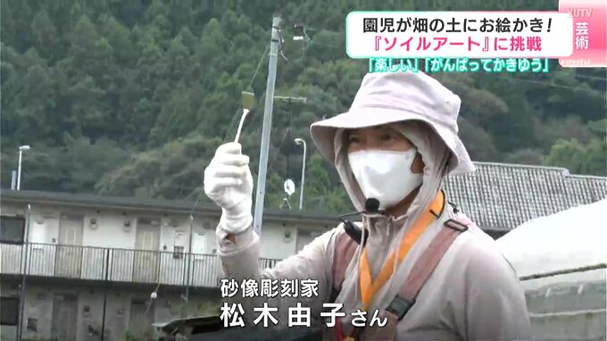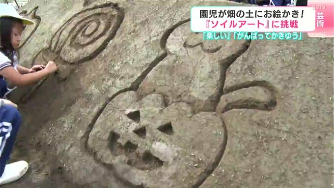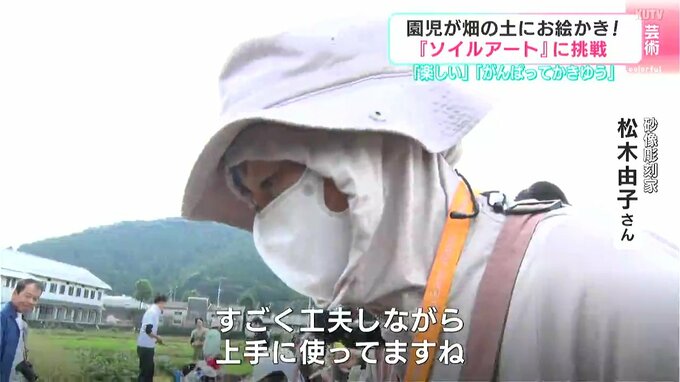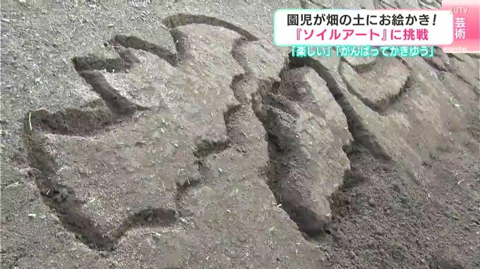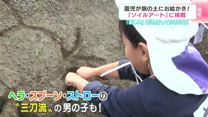素材として使うのは砂ではなくて畑の土です。5日、高知県四万十市で幼稚園児たちが畑の土に絵を描くアート作りに挑戦しました。