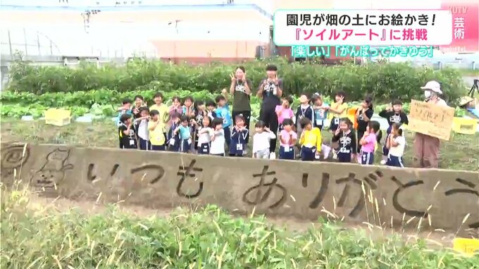 園児たちが絵を描いた反対側には、園児と保護者らから地域の人達へおくる『いつもありがとう』の文字もあります。園児達の「ソイルアート」は雨で自然に崩れるまで残しておくということです。