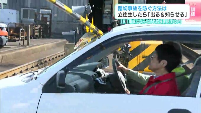訓練は踏切内で車が立往生したという想定です。遮断機が降りて踏切内に取り残された場合は、車を前進させて踏切内から出ることや、踏切に設置してある非常ボタンを押して列車に立往生を知らせることが重要です。また、非常ボタンがない場合でも車に備え付けられた発煙筒を使って列車の運転士に知らせることもできます。