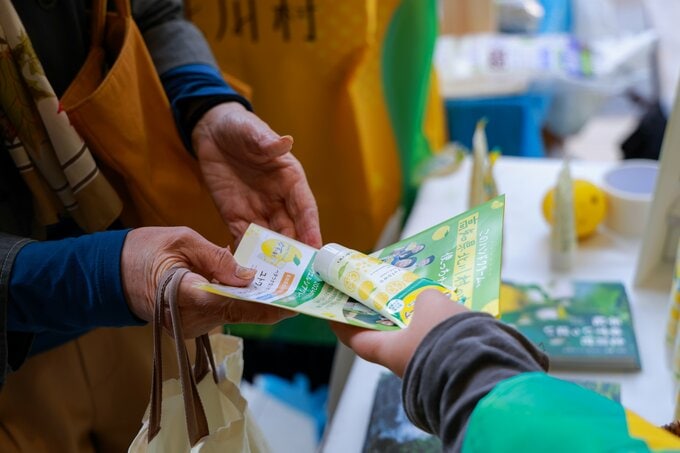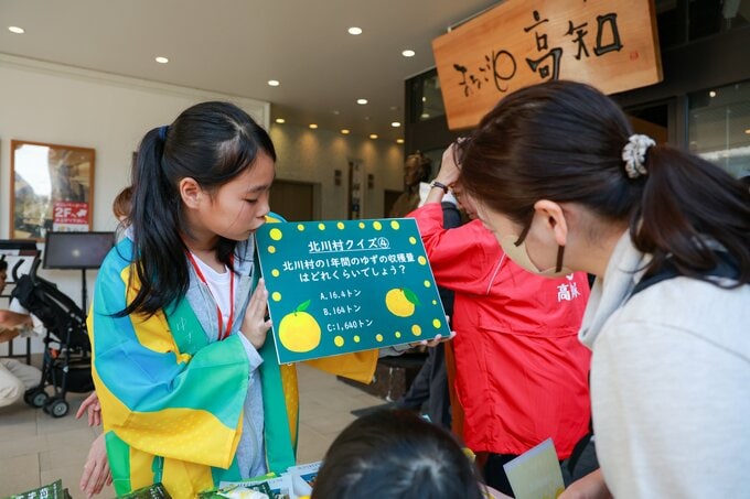 北川村のユズを使った特産品の販売や、ゆず絞り体験。