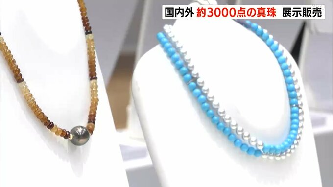 高知市のかるぽーとで8日から始まった「JFえひめパールフェア」。真珠の魅力を知ってもおうと、愛媛県漁業協同組合が1994年から開いています。会場には国内のアコヤ真珠だけでなく、海外で採れた黒真珠などおよそ3000点が並んでいます。今回から初めて18歳の若者に向けたコーナーも設けられ、主催者は真珠を若い人たちにも身近に感じてもらいたいとしています。