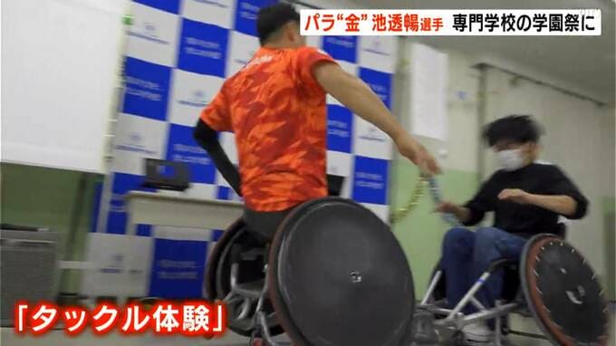 パリパラリンピック、車いすラグビーで金メダルを獲得した、日本代表のキャプテン・池透暢(いけ・ゆきのぶ)選手が、9日、地元・高知の専門学校の学園祭に登場し、生徒たちとの「タックル」で交流を深めました。