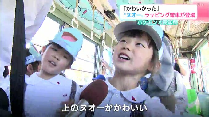 車体や天井には「ヌオーの体」に合わせたカラーリングに県の花のヤマモモと土佐和紙をイメージした模様が描かれています。