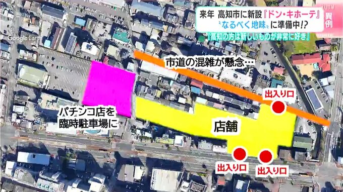 ドン・キホーテによりますと、駐車場の出入り口は、電車通り側に2つ、北の市道側に1つ設置され、北側の出入り口では、市道が狭く交通の混雑が懸念されます。また、近くのパチンコ店の駐車場を借りて「臨時駐車場」とすることが決まっています。