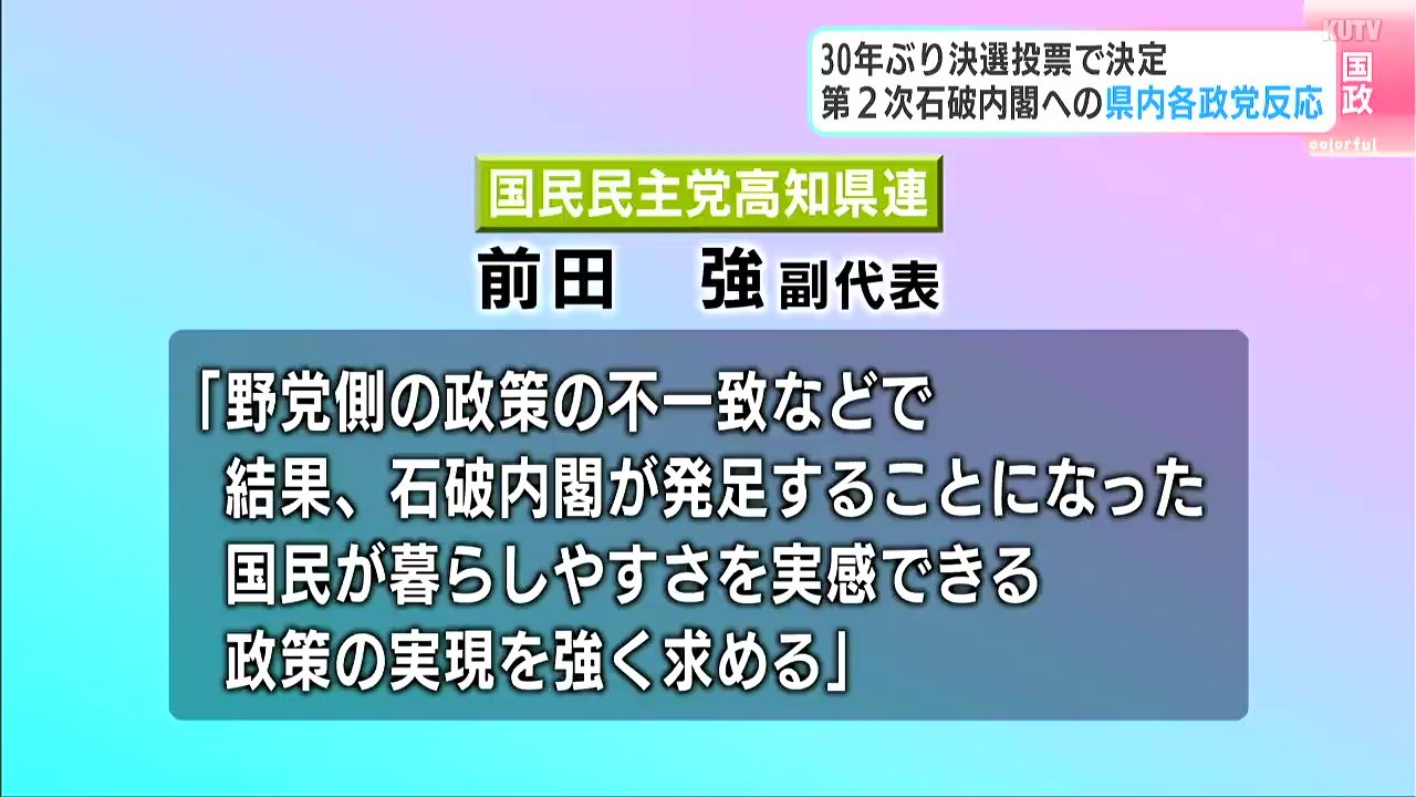 国民民主党県連の前田強副代表は「野党側の政策の不一致などで結果、石破内閣が発足することになった。国民が暮らしやすさを実感できる政策の実現を強く求める」としています。