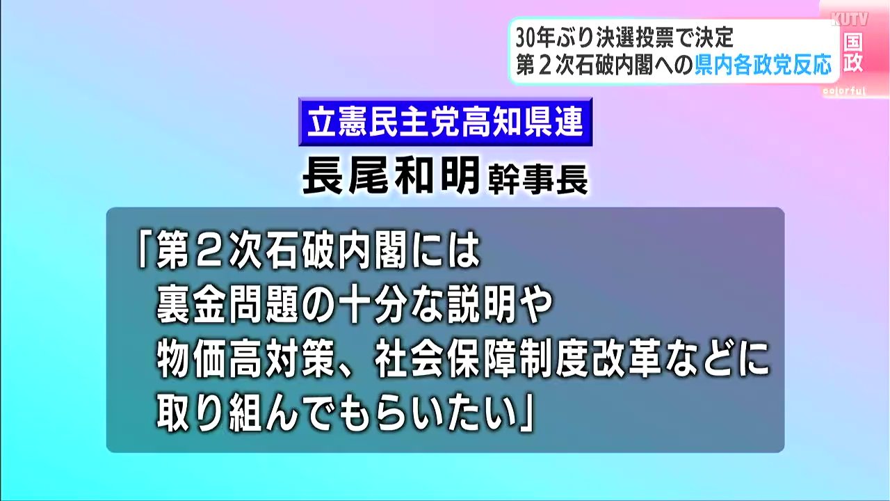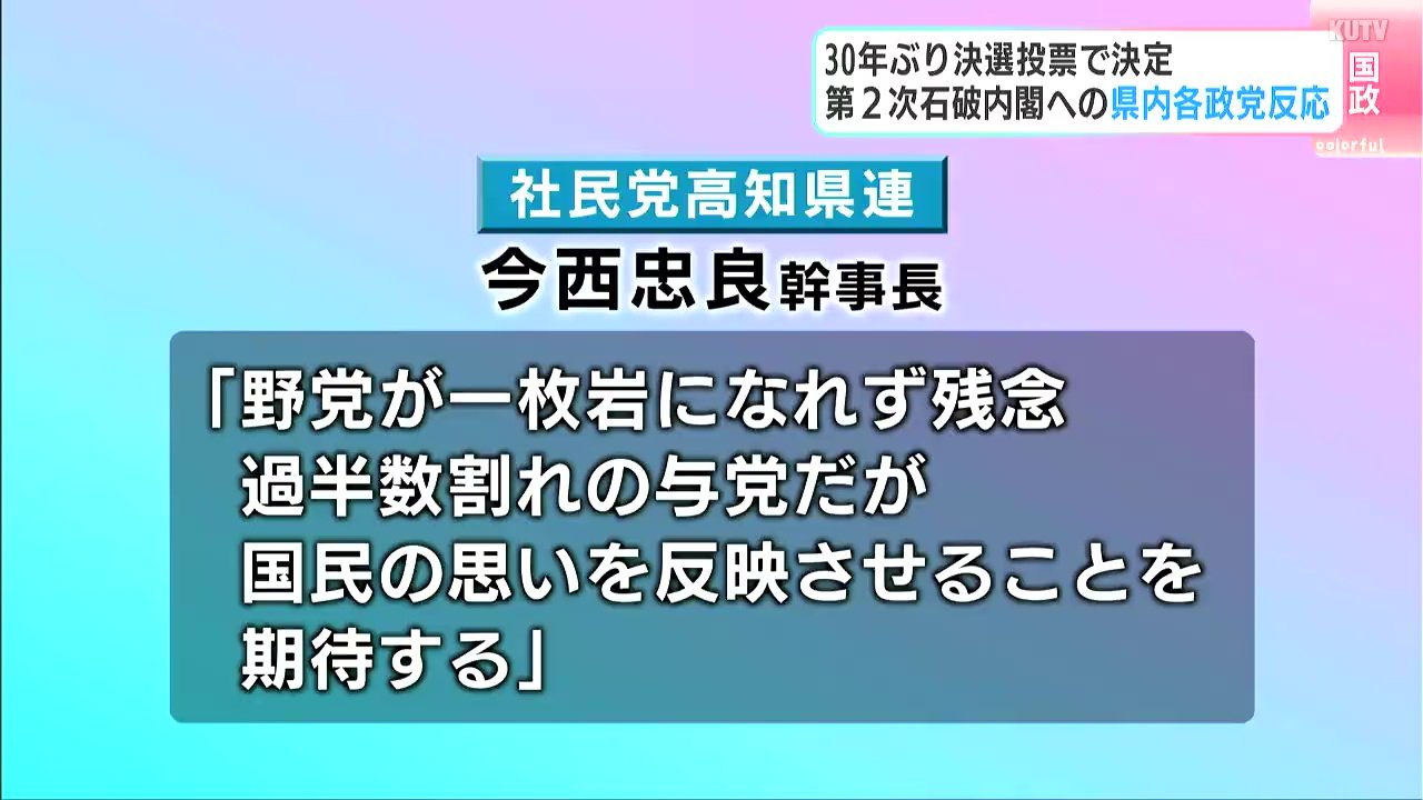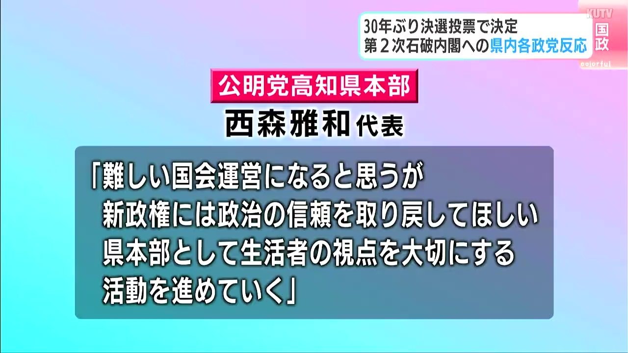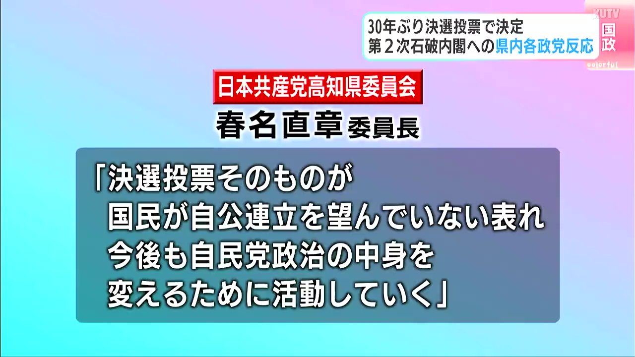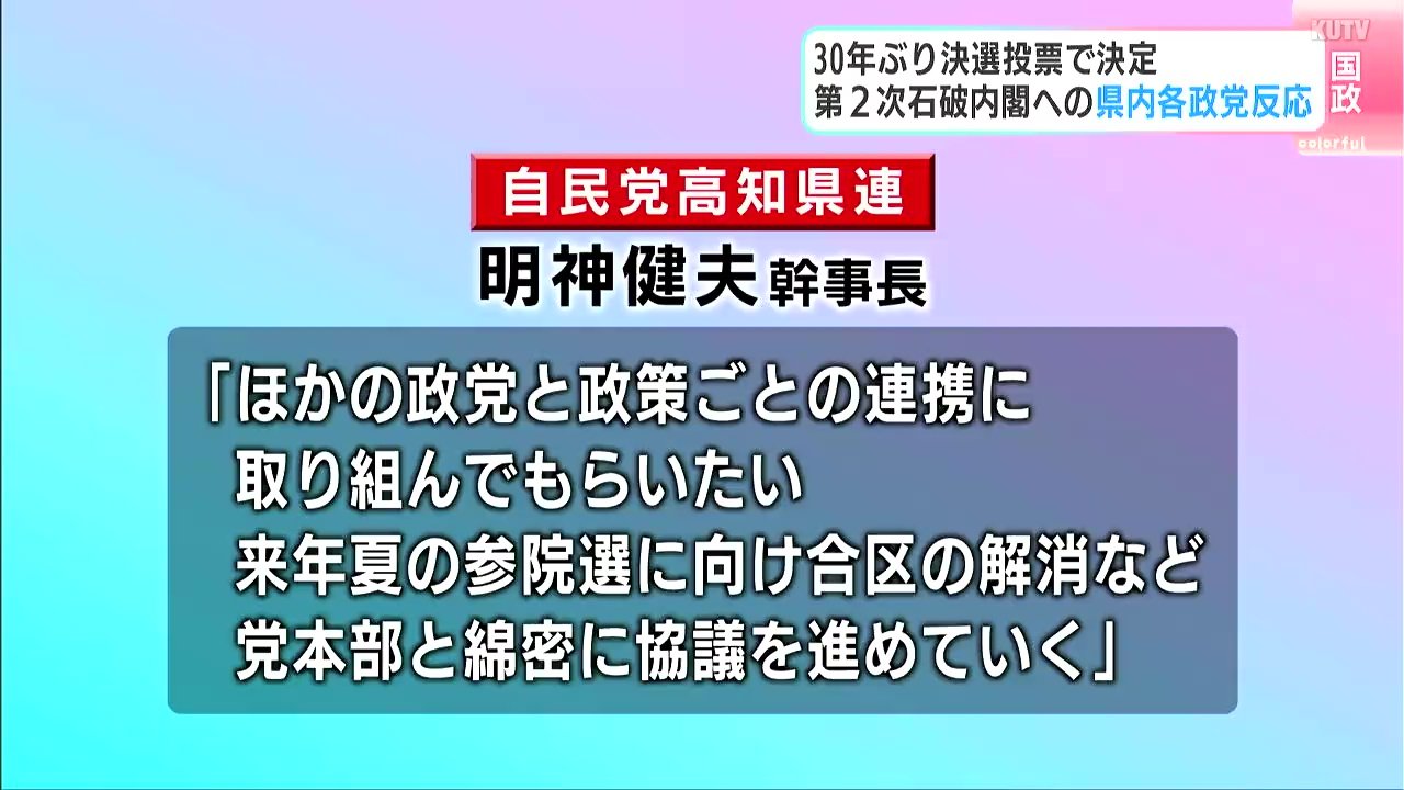 11日夜、第2次石破内閣の発足を受け、高知県内各政党の受け止めをまとめました。