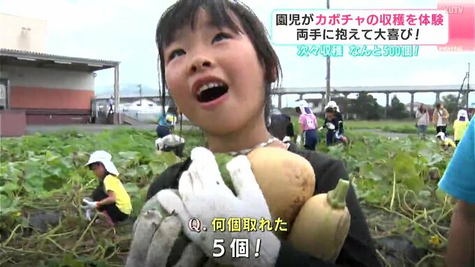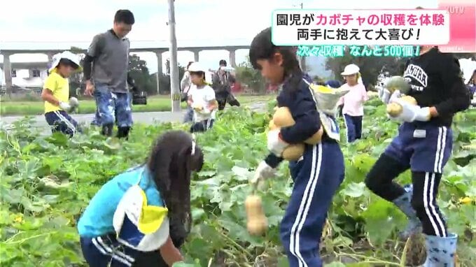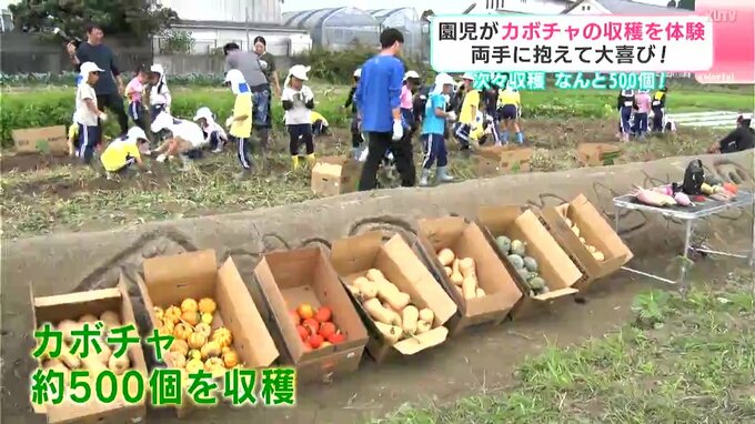 14日は中村幼稚園の年長組の園児、32人がカボチャの収穫を体験しました。園児たちは、色とりどりのカボチャやひょうたん型の変わった形のカボチャを次々と収穫していき、両手にかかえて大喜びでした。