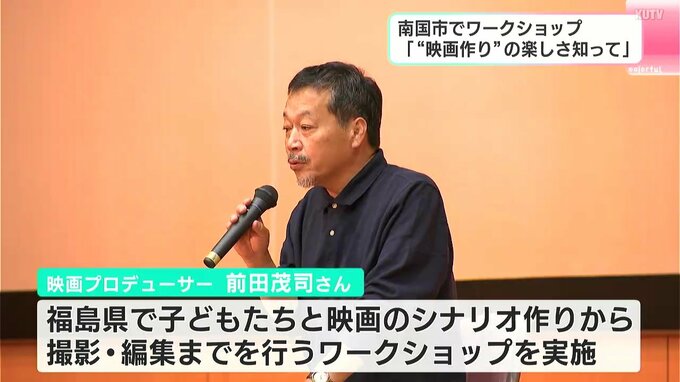 前田さんから受けたノウハウをもとに、高知県内の子どもたちを対象にワークショップを行っている安藤さん。「映画作りは社会の縮図だ」としたうえで、子どもたちが映画作りに励むことで協調性や社交性、表現力などあらゆる成長が目に見えて感じられると話します。
