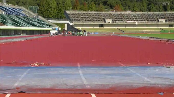 トラック舗装の工事が行われているのは春野総合運動公園の陸上競技場です。陸上競技場は日本陸上競技連盟から高知県内で唯一「第1種公認」を受けていて、連盟主催の全国規模の大会や国際大会などで使用できます。