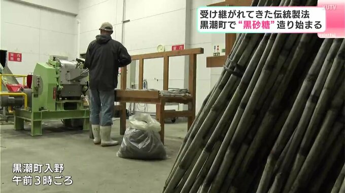 午前3時。黒潮町入野(いりの)にある加工施設で行われているのはサトウキビの皮を剥ぎ、汁を搾る作業です。