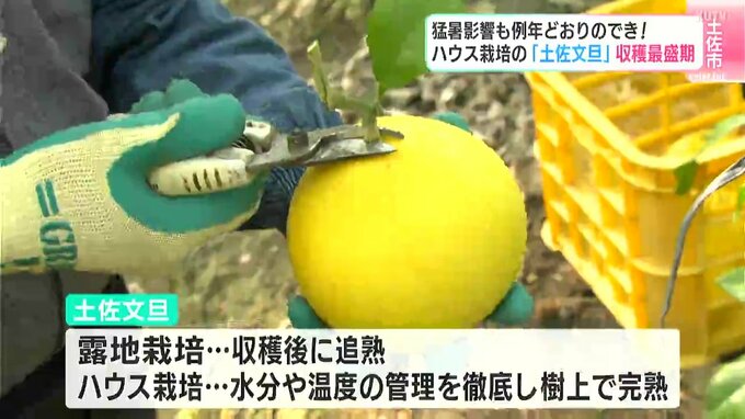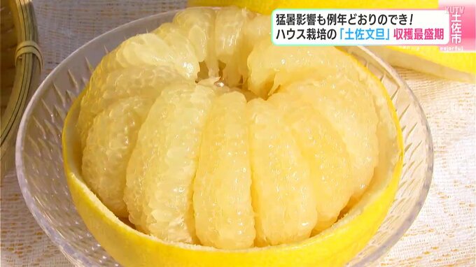 ハウス栽培の土佐文旦は露地栽培よりも収穫時期がおよそ1か月早く、主にお歳暮などの贈答用として取り引きされます。収穫後に追熟(ついじゅく)させる露地栽培の土佐文旦と違い、ハウス栽培では、水分や温度の管理を徹底することで樹上で完熟させるのが特徴で、甘みも強くなるということです。