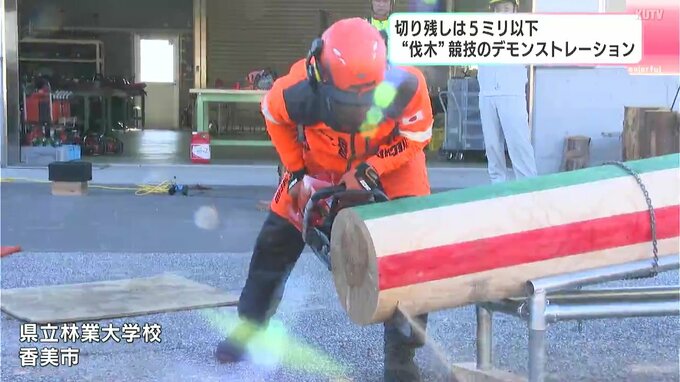 林業の技術と安全性を競う伐木(ばつぼく)の日本代表選手が高知県立林業大学校で競技のデモンストレーションを行いました。