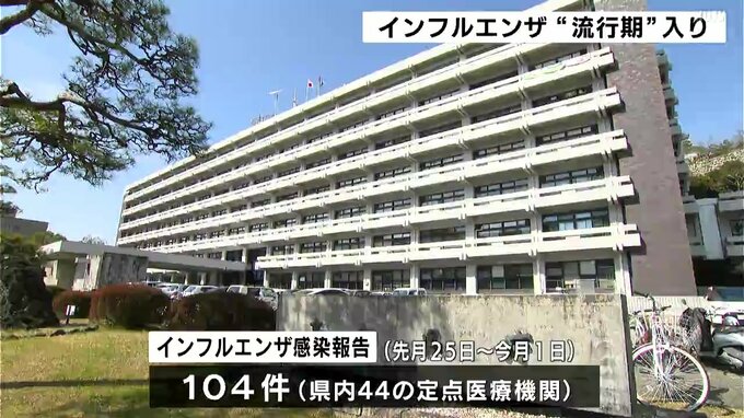 高知県によりますと11月25日から12月1日までの1週間に高知県内44の定点医療機関から104件のインフルエンザ感染報告がありました。