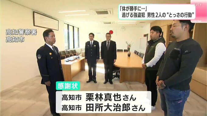 「体が勝手に…」逃げる強盗犯 男性2人の“とっさの行動” 容疑者の逮捕に協力した2人に警察から感謝状 2024年12月4日(水) 18:57 国内 暮らし・マネー 2024年10月、高知県高知市帯屋町で発生した強盗傷害事件で、容疑者の逮捕に協力した2人に対して、警察から感謝状が贈られました。感謝状を受け取ったのは、高知市の栗林真也さん(29)と田所大治郎さん(32)です。…