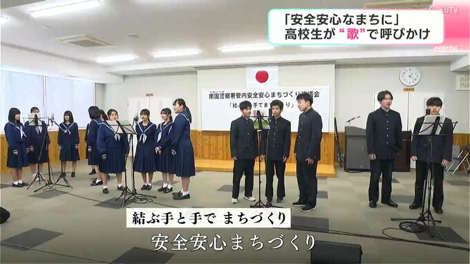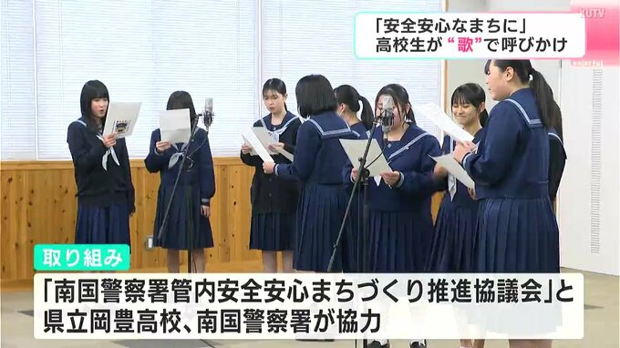 この取り組みは、地域住民を事故や犯罪から守ろうと、「南国警察署管内安全安心まちづくり推進協議会」と高知県立岡豊高校、南国警察署が協力して行われました。作詞は協議会のメンバーが、作曲は岡豊高校の音楽教諭が担当しました。
