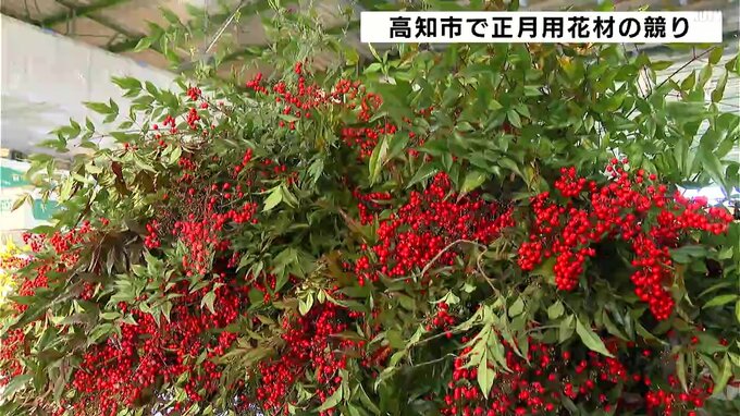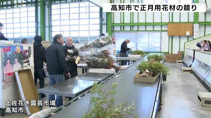 高知市の土佐花き園芸市場では正月飾りに使われる花材の競りが行われ、県内外から生花店が参加しました。