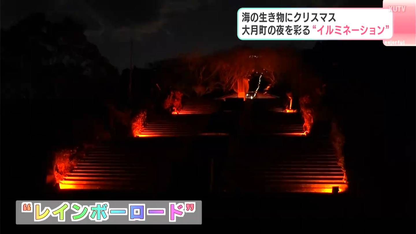 展望台に通じる階段は道の駅を運営する“大月町ふるさと振興公社”が色が変わる照明でライトアップを行っています。名付けて『レインボーロード』。中段では、滝のような光のカーテンが見られます。これらのイルミネーションは2025年1月13日までです。