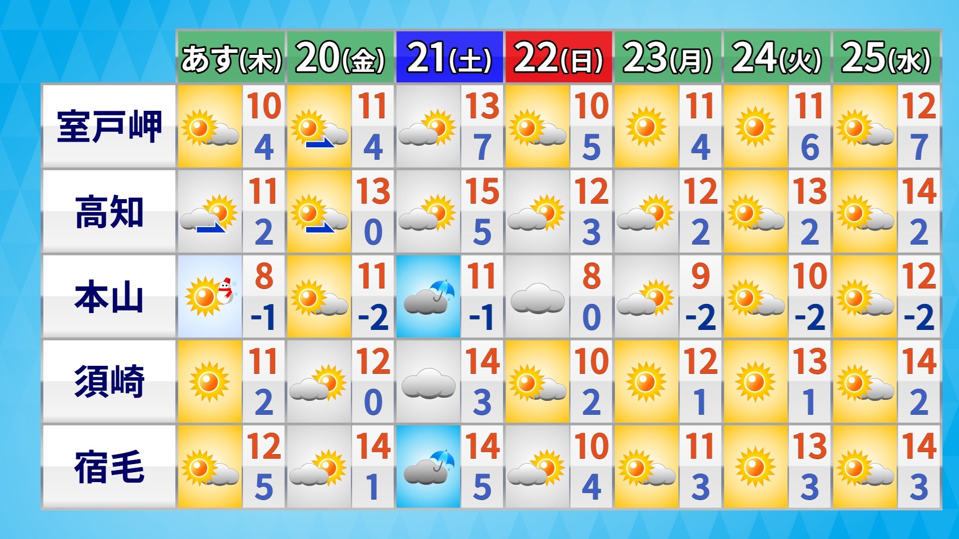 20日金曜日は寒気の影響で今季一番の冷え込みとなる所があり、高知市では最低気温が0度となる予想です。21日土曜日は低気圧や前線の影響で雨の降る所もありそうです。日曜日以降天気は回復しますが、平年よりも厳しい寒さが続く見通しです。(気象予報士・東杜和)